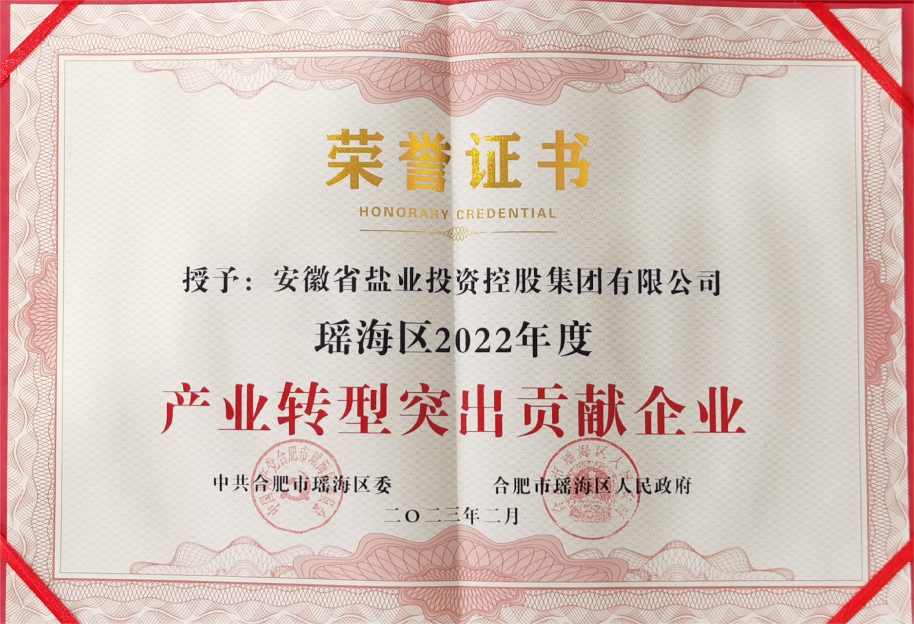 近日,省鹽業集團獲得瑤海區委、區政府授予的瑤海區2022年度“產業轉型突出貢獻企業”榮譽稱號。