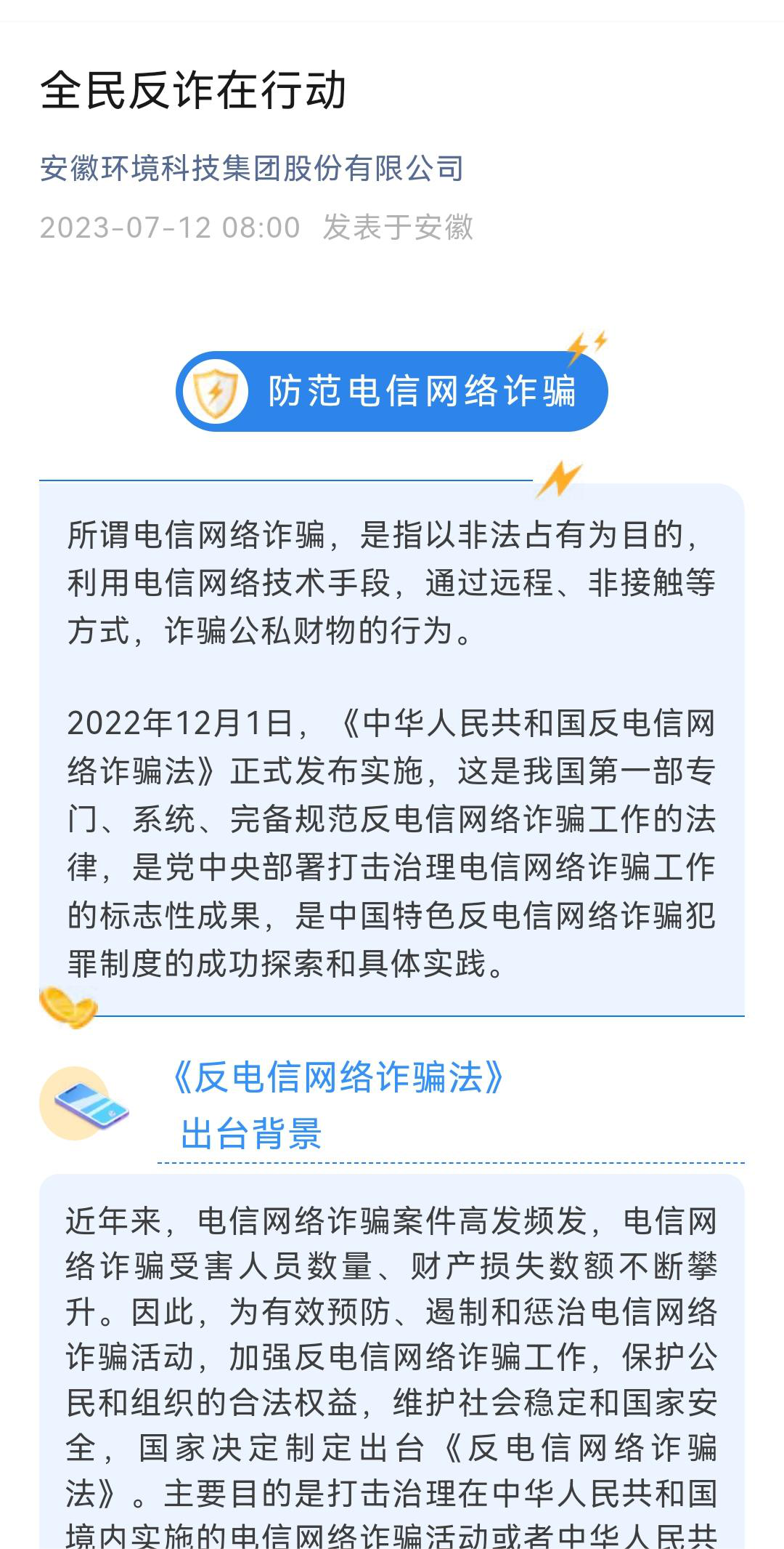 環境科技集團、省健康養老、徽鹽金融等公司通過印制各類反詐宣傳單、宣講防范電信詐騙安全知識,在公眾號發表普法文章等形式,號召全體員工增強防范意識。
