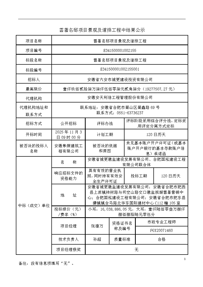 雲著名邸項目景觀及道排工程中結果公示